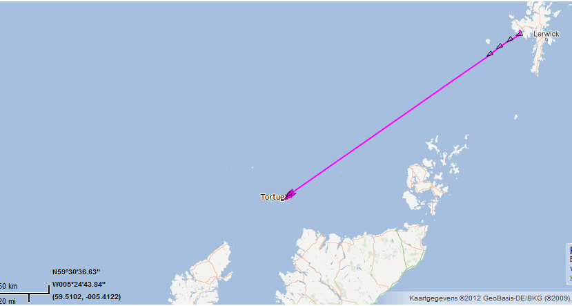 Eenmaal buiten is het veel rustiger en op de gewone fok maken we mooie vooruitgang, ruime wind, koers Zuidwest naar de Hebriden.
